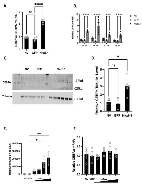 Nkx6.1 overexpression induces CEBPA expression. (A) INS-1 832/13 β-cells or (B) Primary rat islets were transduced with AdCMV-GFP or AdCMV-Nkx6.1 at an MOI of ~150, and induction of CEBPA mRNA levels and protein levels were measured (C,D). (E) Transduction of INS-1 832/13 β-cells with AdCMV-GFP at an MOI of ~150 or AdCMV-c-Fos at an MOI of ~150 and descending by serial dilutions (i.e., 150, 75, 37.5, and 18.8 MOI) expressing mouse c-Fos increases c-Fos levels, but (F) fails to induce CEBPA levels. n = 3–6. NV represents “No Virus” and GFP represents AdCMV-GFP. AdCMV-GFP was used at an MOI of ~150. Open circles represent data points. ns = non-significant. * p < 0.05, ** p < 0.01, *** p < 0.001, and **** p < 0.0001.