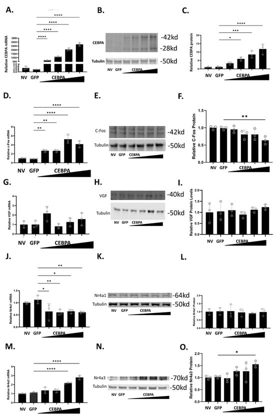 CEBPA overexpression increases protein level of Nr4a3. INS-1 832/13 β-cells were untreated or transduced with AdCMV-GFP at an MOI of ~150 or AdCMV-CEBPA at an MOI of ~150 and descending by serial dilutions (i.e., 150, 75, 37.5, 18.8). Following a 48 h incubation, mRNA and protein levels were measured for CEBPA (A–C), c-Fos (D–F), VGF (G–I), Nr4a1 (J–L), and Nr4a3 (M–O). Levels of mRNA are presented in (A,D,G,J,M). Representative Western blots are presented in (B,E,H,K,N). Quantification for the Western blots are presented in (C,F,I,L,O). n = 3. NV represents “No Virus”. * p < 0.05, ** p < 0.01, *** p < 0.001, and **** p < 0.0001.