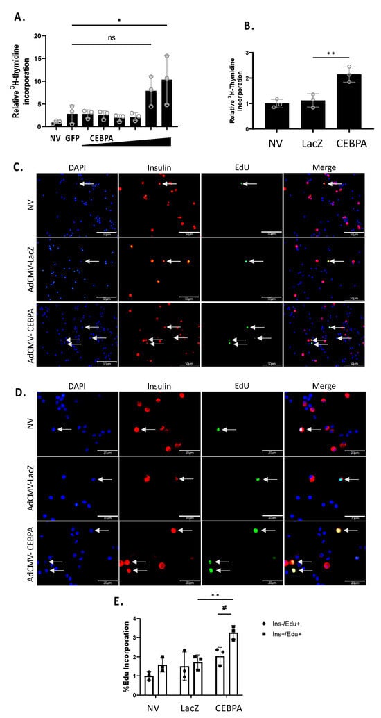 CEBPA overexpression induces β-cell proliferation. INS-1 832/13 β-cells were transduced with AdCMV-GFP at an MOI of ~150 or AdCMV-CEBPA at an MOI of ~150 and descending serial dilutions (i.e., 150, 75, 37.5, and 18.8 MOI). Following a 72 h incubation, cells were labelled with 3H-thymidine for 15 min and incorporation was measured, indicating DNA replication and proliferation (A). Primary rat islets were transduced with AdCMV-LacZ at an MOI of ~150 or AdCMV-CEBPA at an MOI of ~150. Following a 48 h incubation, islets were labelled with 3H-thymidine for 24 h and incorporation was measured, indicating DNA replication and proliferation (B). Primary rat islets were transduced with AdCMV-LacZ at an MOI of ~150 or AdCMV-CEBPA at an MOI of ~150. Following a 48 h incubation, islets were labelled with EdU for 24 h. Cells were stained for EdU incorporation (green), nuclei (DAPI) and insulin expression (red) to label beta cells and incorporation was measured, indicating DNA replication and proliferation. Select images at 40× (C) and 100× (D) are presented. Quantification demonstrates a significant increase in β-cell proliferation following CEBPA overexpression and no significant change in non-β-cell proliferation (E). ns = not significant, n = 3. * or # p < 0.05 and ** p < 0.01.