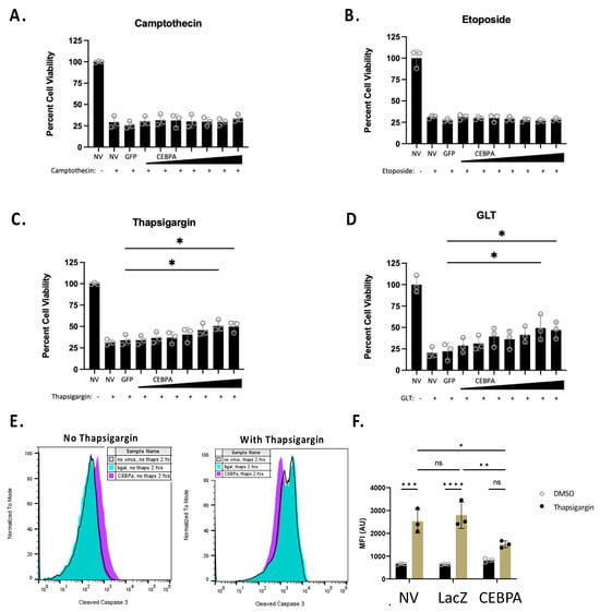 CEBPA decreases thapsigargin- and glucolipotoxicity-induced cell death. INS-1 832/13 β-cells were transduced with AdCMV-GFP at an MOI of ~150 or AdCMV-CEBPA at an MOI of ~150 and descending serial dilutions (i.e., 150, 75, 37.5, and 18.8 MOI). Following 48 h of incubation, cells were untreated or cultured with (A) camptothecin (2.0 μM), (B) etoposide (9.0 μM), (C) thapsigargin (0.3 μM), or (D) glucolipotoxic conditions (GLT, 25 mM glucose and 0.5 mM palmitate). (E) INS-1 832/13 β-cells were transduced with AdCMV-LacZ at an MOI of ~150 or AdCMV-CEBPA at an MOI of ~150, and activated caspase 3 was measured by flow cytometric measurements with and without thapsigargin, (F) with quantification to highlight the decrease in activated caspase 3. n = 3. NV represents “No Virus”. ns = not significant, * p < 0.05, ** p < 0.01, *** p < 0.001, and **** p < 0.0001.