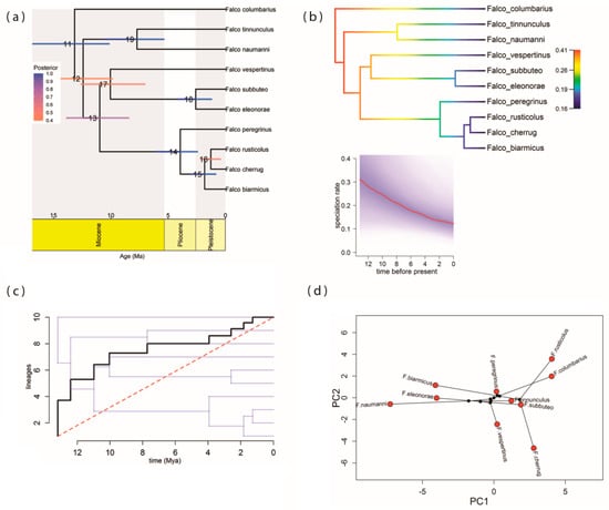 (a) Maximum clade credibility tree (MCCT) of genus Falco in Europe (see text for further information). Bars correspond to the 95% highest posterior density (HPD) confidence intervals of the node age, colored by the posterior probability of the clade. Each node of the MCCT is numbered. Ma: megaannum. (b) Rates of falcon species diversification (phylorate plot) inferred with BAMM, with branches colored according to the net diversification rate. Warmer colors represent faster rates. Inset plot shows speciation rates through time estimated with BAMM. Shaded area depicts 95% confidence interval. Time in millions of years. (c) Lineage-through-time plot (LTT) showing falcon species accumulation in time. The dotted red line represents the expected number of lineages under a pure-birth process. Mya: million years ago. (d) Phylogenetic PCA for multivariate climatic niche space, with PC1 and PC2 loadings plotted on x and y axes. Black lines indicate the phylogenetic relationships between species.