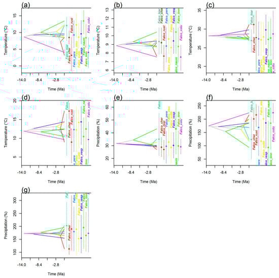 Inferred history of the evolution of climatic tolerance in European falcon clade based on MCCT. Interior nodes indicate the mean of climatic tolerance inferred for the most recent common ancestor of the extant falcon species. Each species is represented by a color that is preserved from one variable to another. For each species, the point indicates the mean climatic tolerance and the vertical dashed line (of the same color) indicates the 80% central density of climatic tolerance. Species names consist of the first letter of the genus and the first three letters of the species name. (a) annual mean temperature; (b) annual mean diurnal range; (c) annual temperature range; (d) mean temperature of wettest quarter; (e) precipitation seasonality; (f) precipitation of warmest quarter; (g) precipitation of coldest quarter.