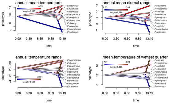 Temperature and precipitation information used to infer the present climatic niches of falcon species was acquired from the WorldClim database (https://www.worldclim.org, accessed on 13 June 2021) as 19 bioclimatic variables (Supplementary Table S1) at a 2.5 min (≈5 km) spatial resolution. We searched for multicollinearity in our data with the usdm library in R [], using a correlation coefficient threshold of 0.7. After excluding collinear variables, we retained seven climatic variables for modeling the climatic evolution of falcons in Europe: annual mean temperature (Bio1), annual mean diurnal range (Bio2), annual temperature range (Bio7), mean temperature of wettest quarter (Bio8), precipitation seasonality (Bio15), precipitation of warmest quarter (Bio18), and precipitation of coldest quarter (Bio19).