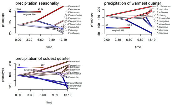 Convergent evolution for the falcon clade in Europe, as phylogenetic PCA (Figure 1d) and ancestral climatic niche reconstruction analyses revealed (Figure 2, Figure 3 and Figure 4), suggested an Ornstein–Uhlenbeck constrained model of climatic evolution. Convergent evolution is among the most powerful lines of evidence for the power of natural selection in shaping organisms to their environment [], which is the antithesis of phylogenetic signal []. A single model of trait evolution cannot explain by itself the climatic evolution of falcons for the entire dataset, with OU1 and BM1 models being similarly informative (Table 2). In addition, the OU1 model is frequently incorrectly favored over simpler models when using likelihood ratio tests, mainly with datasets that are small, as in the present case []. Although the OU multipeak model (OUM) was a more biologically realistic model for many datasets [], it was not statistically favored for our data, albeit climatic niche reconstruction (Figure 2, Figure 3 and Figure 4) and PGLS analyses (Figure 5) pointed out those species with subtropical and mid-latitude distributions (F. eleonorae, F. naumanni, F. biarmicus and, to a lesser extent, F. cherrug) as having the highest climatic optima, compared with those species with arctic/boreal and multilatitude distributions in Europe. This is especially true for annual mean temperature (Bio1), precipitation seasonality (Bio15), and annual mean diurnal range (Bio2), with lowest values for precipitation of the warmest quarter (Bio18) (except for F. cherrug), in line with their geographic distribution, and the highest degree of specialization, in accordance with the climate variability hypothesis that predicts that tropical (subtropical) organisms should have narrower physiological thermal breadths compared to organisms in temperate zones []. An example of convergent evolution revealed by this work was also highlighted among F. rusticolus and F. columbarius, especially for annual mean temperature (Bio1), based on ancestral niche reconstruction plots (Figure 2, Figure 3 and Figure 4) and a convergent strength test. Both species are among the falcon species most tolerant to low temperatures, their habitats stretching from a circumpolar distribution in arctic and subarctic regions (F. rusticolus) to low arctic and cold temperate regions, including boreal forests (F. columbarius).