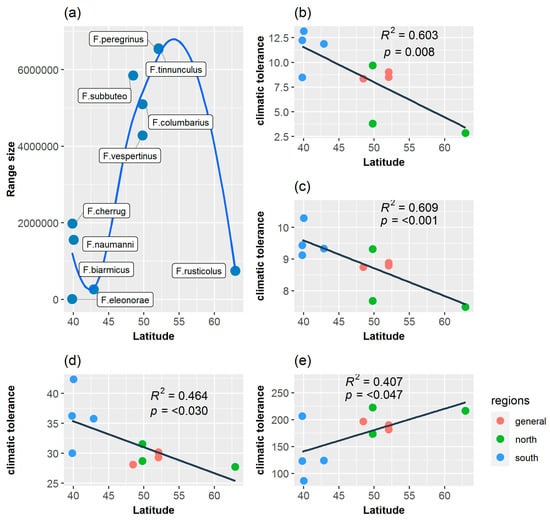 Relationships between latitude and falcon species range size (a) between latitude and mean climatic tolerance (weighted mean of the PNOs) for annual mean temperature (b), annual mean diurnal range (c), precipitation seasonality (d), and precipitation of warmest quarter (e). Colored points represent the falcon species categories based on latitudinal position on which their geographical range is centered (general: multilatitude species; north: arctic, boreal, and temperate species; south: mid-latitude and subtropical species). The grouping of the ten falcon species in the three categories is indicated in the methodology. Regression lines are produced using Phylogenetic Generalized Least Squares (PGLS).