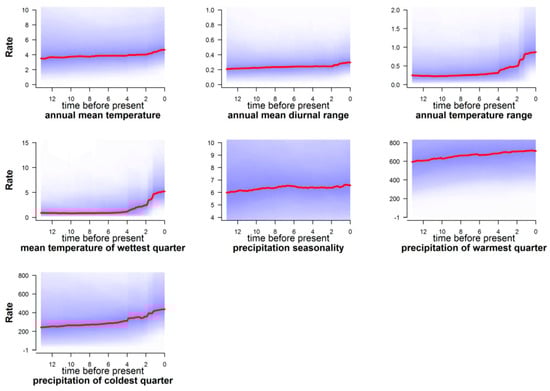 In order to estimate and detect changes in the rate of climatic niche evolution, we applied BAMM version 2.5.0 (Bayesian Analysis of Macroevolutionary Mixtures), a C++ program [,]. This model was used both for estimation of speciation–extinction rates (diversification) and climatic evolutionary rates across the MCCT.
