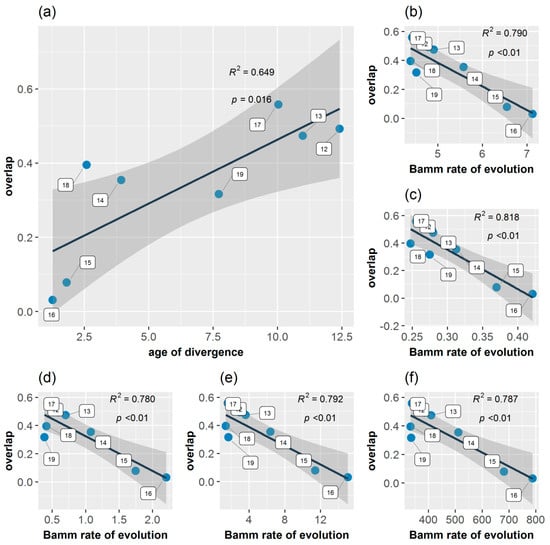 Scatterplots showing the relationships between the divergence time and the degree of range overlap (age range correlation) among closest relative species of falcons (a) and between the degree of range overlap and BAMM rate of climatic niche evolution for annual mean temperature (b), annual mean diurnal range (c), annual temperature range (d), mean temperature of the wettest quarter (e), and precipitation of the coldest quarter (f). Blue filled circle are nodes of the MCCT, indicated by the corresponding numbers (according to Figure 1a). The R2 and p-values are listed for each relationship. Shaded grey areas around each regression line indicate 95% confidence intervals. Node 17 overlaps node 12.