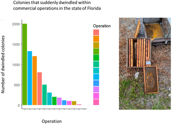 (Left) The number of colonies in each operation that suddenly dwindled. (Right) A typical dwindled colony with a patch of brood and insufficient adult bees to cover the brood area. This colony lost approximately 90% of its adult bee population in the span of 3 weeks.