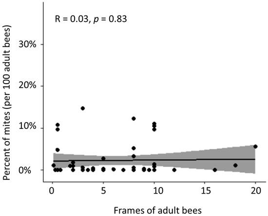 Varroa destructor detections on adult bees in colonies of various sizes (r(51) = 0.03, p = 0.83). Dots represent individual colonies, shown with regression fit line and 95% confidence band.