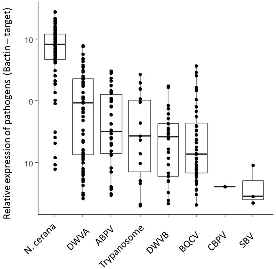 All data were analyzed using base R, in R Studio. Associations of target pathogens were analyzed using a Spearman coefficient, using p < 0.05 for statistical significance. Associations between parasite infestation and colony strength were analyzed using the non-parametric Kruskal–Wallis test. The Pearson coefficient was used for associations between pathogen load and size of colonies.