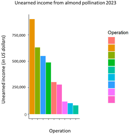 Severe losses and morbidity resulted in the immediate loss of pollination income for 9 of the 12 operations in this study. Operations sent 34.1% to 100% fewer colonies to almonds than anticipated (M = 70.4%, SD = 22.9%). This represented an estimated loss of USD 3,451,420 anticipated income from almond pollination across the nine operations (Figure 4).