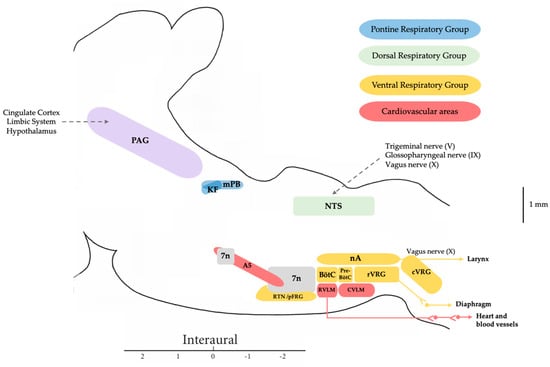 The PAG plays a crucial role in the regulation and integration of defensive behaviors, autonomic responses, and the processing of painful stimuli in mammals. In the respiratory domain, the PAG is associated with the integration and adaptation of respiratory responses under different conditions. The stimulation of dlPAG and lateral periaqueductal grey matter (lPAG) induces tachypnea and they are mostly involved in active coping strategies, such as fighting or fleeing, while the stimulation of dorsomedial PAG and ventrolateral periaqueductal grey matter (vlPAG) elicited bradypnea, profound respiration, dyspnea, and inspiratory apneas that it is associated with passive coping strategies, such as freezing [29,32,41,42]. These responses are mediated by projections to premotor interneurons in the pons and the nRA in the medulla [38,43].