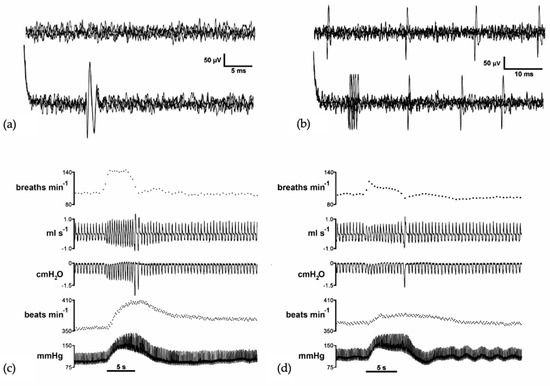 Extracellular recordings of three putative cells recorded from the A5 region. (a) Silent neuron (upper trace, four superimposed sweeps). The lower trace shows constant latency responses (four superimposed sweeps) to the dlPAG stimulation. (b) Spontaneously active cell (upper trace, five superimposed sweeps). The lower trace shows excitations with short latency responses from dlPAG stimulation (five superimposed sweeps). Instantaneous respiratory rate (upper trace, rpm), respiratory flow (mL/s), pleural pressure (cmH2O), instantaneous heart rate (bpm), and blood pressure (mmHg) in a spontaneously breathing rat showing the cardiorespiratory response evoked on dlPAG stimulation (c) before the microinjection of muscimol in the A5 region (50 nL over 5 s) and (d) after the microinjection of muscimol in the A5 region (50 nL over 5 s). Black line shows the onset of the dlPAG electrical stimulation (5 s). Authors’ figure modified from [32].