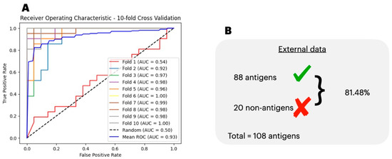 AUC for antigenicity. (A), we show the test Area Under the Curve (AUC) score for each fold of a Deep Learning Artificial Neural Network classifying between antigens and non-antigen data. The mean AUC score was 0.93 ± 0.13. (B), we show the performance of PoxiPred’s antigen predictor in identifying an external dataset of known antigenic proteins.