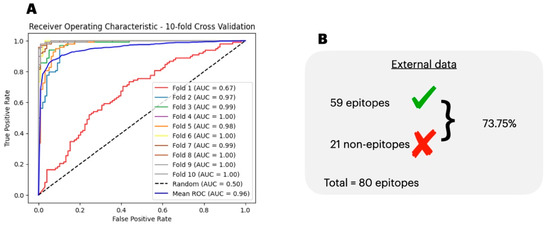 To determine the best algorithm for classifying the epitopes, we ran our data split in training/testing subsets through six different classification algorithms (Table S3). From the initial search with six non-Deep Learning algorithms, we report that none of them achieved a satisfactory classification performance as they failed to show a classification report equal to or higher than 70% in the accuracy, precision, recall, and F1 score. Next, we ran the data through a DL-ANN to try to obtain a better performance in classifying the epitopes. We iterated over one, two, and three hidden layers each with 10, 25, and 50 neurons over 100 learning epochs (Table 2). We report the best classification performance as being three hidden layers with 50 neurons each as it resulted in a test accuracy, specificity, recall, precision, and loss of 0.93, 0.99, 0.86, 0.99, and 0.09, respectively. Moreover, in Figure 3A, we show the AUC over each step of the 10-fold cross-validation process, which when averaged, resulted in a mean AUC of 0.96 ± 0.09. In Figure 3B, we show the generalization capacity of the antigen prediction model, which correctly labeled 73.75% of the external data.