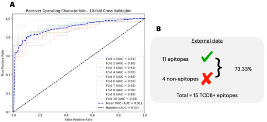 AUC for CD4+ and CD8+ epitope classification in a 10-fold cross validation step over the test folds. (A), we show the test Area Under the Curve (AUC) score of an Extreme Gradient Boosting (XGBoost) classification between the CD4+ and CD8+ T-cell epitopes. The mean AUC was 0.91 ± 0.03. (B), we show the performance of our model in classifying the independent data.