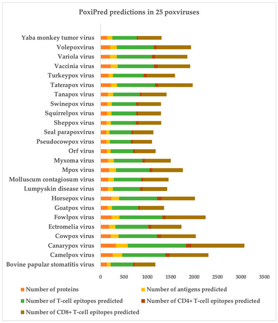 In Figure 5, we show a histogram consisting of the submission of the proteome files of 25 different poxviruses applied to the PoxiPred predictor. For each poxvirus (y-axis), we show the count of PoxiPred (x-axis) for the total number of proteins in the proteome file (orange), number of proteins predicted as potential antigens (yellow), number of total T-cell epitopes predicted (green), number of TCD4+ epitopes predicted (olive), and number of TCD8+ epitopes predicted (maroon).