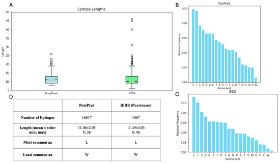 Comparison of the PoxiPred predictions and experimentally validated epitopes of orthopoxviruses. (A) shows the length distribution of each set of epitopes, and (B,C) show the most common amino acids amongst each set of epitopes (PoxiPred’s and IEDB, respectively). Finally, (D) summarizes the number of epitopes, and the mean, most, and least common amino acids.