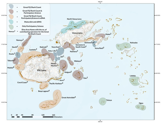- Ward-Paige, C.A.; Sykes, H.; Osgood, G.; Brunnschweiler, J. Community-driven shark monitoring for informed decision making: A case study from Fiji. Pac. Conserv. Biol. 2022, 29, 402–418. [Google Scholar] [CrossRef]
