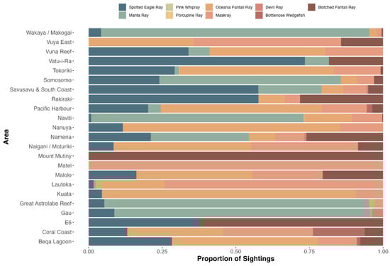 Ray species observations by area during the GFSC, including proportions of sightings.