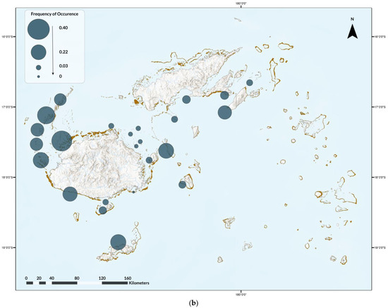 Nine ray species were recorded on 3838 dives (13%), for a total of 2965 rays. Diversity was highest in Naviti, with seven species, followed by Savusavu and South Coast and Pacific Harbour, with six species each, and Tokoriki, Coral Coast, Namena, Somosomo, and Wakaya, with five species each (Figure 2). No ray species were observed in all areas, but, from most to least common by area were the spotted eagle ray (as Aetobatus narinari; Euphrasen, 1790, 20 areas) and maskray (as bluespotted stingray, D. kuhlii; Müller and Henle, 1841, 20 areas), Oceania fantail ray (as T. lymma; Forsskål, 1775, 18 areas), blotched fantail ray (Taeniurops meyeni, Müller and Henle, 1841, 16 areas), manta ray (both species, 10 areas), devil rays (three areas), and bottlenose wedgefish (as wedgefish, three areas) (Figure 2). In addition, two pink whiprays (Pateobatis fai, Jordan and Seale, 1906) were reported from Naviti in the Yasawas in November 2014 and one porcupine ray (Urogymnus asperrimus, Bloch and Schneider, 1801) was reported from Tokoriki in April 2014. The relative abundance and frequency of occurrence varied. Rays were most abundant in the Ba Province (Figure 3a), and most frequently observed in the Western Division and least in the areas of Suva, Vatu-i-Ra, Vuya East, and Mount Mutiny (Figure 3b). The Kruskal-Wallis test revealed no significance between divisions, with p = 3.622 × 10−8 (Supplementary S4).