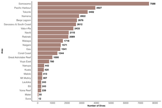 Number of dives performed in each of the 24 surveyed areas during the study period. In total, 39,892 dives were performed.