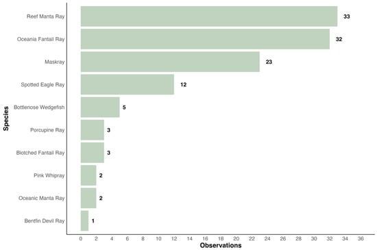 A total of 124 observations of ten different ray species have been uploaded to iNaturalist since 2006, of which 116 were validated by other users (Figure 6). All major island groups, except for the Lomaiviti Group, were present (Viti Levu, Vanua Levu, Taveuni, Kadavu, Yasawa Islands, Lau Island Group). Most observations were uploaded for reef manta rays (majority of observations from the Yasawa Islands with several sightings from Wakaya and Kadavu), followed by Oceania fantail rays (observations from several islands with the highest density of sightings in the Mamanuca Islands), maskrays (mostly around Viti Levu but also including Taveuni and Ogea Island), spotted eagle rays, A. ocellatus, Kuhl, 1823 (observations from across Fiji), bottlenose wedgefish (observations from Viti Levu, Vanua Levu, and Ogea Island), pink whiprays (observations from Wakaya and Vanua Levu), blotched fantail rays (observations from the Yasawa Islands), oceanic manta rays (observations from Laucala Bay off Suva), porcupine rays (observation from Viti Levu), and a single research grade identification of a bentfin devil ray (observation from Vanua Levu). No records of skates in Fiji were found on iNaturalist.org.