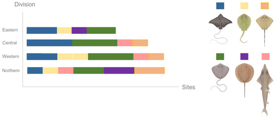 DNA was collected from six ray species; however, none of the ray species were detected at every site sampled. Despite the lower sampling effort, the Northern Division exhibited the highest ray diversity, with DNA from six ray species, followed by the Western Division, with five identified species. The Central and Eastern Divisions each revealed four species (Figure 7). The pink whipray appeared most frequently, identified in ten (35.71%) out of the 28 samples.