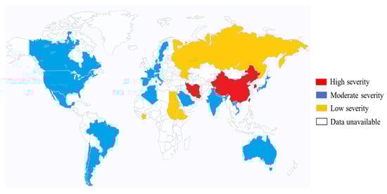 Global distribution of hvKp. The severity of hvKp is differentiated by color. Regions with high severity have endemic spread of hvKp. This manifests as severe clinical outcomes in regions. Moderate severity regions have moderate case studies of hvKp infections. Likewise, the low-severity region has few hospital-reported cases of hvKp infection [65,66,67,68,69].