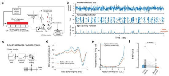 We recorded the single-unit activity of VPm neurons in response to whisker stimulus composed of repeated frozen white Gaussian noise (WGN) patterns while varying the activation condition of the LC-NE system in pentobarbital-anesthetized rats (Figure 1a). In response to multiple presentations of the same WGN whisker stimulation, VPm neurons responded reliably at specific time points, which presumably correspond to sections of the stimulus which closely match the kinetic features for which the neuron selectively encodes. Once multiple responses of a neuron to the same frozen WGN stimulus had been recorded, a spike density function (SDF) was generated by first collapsing the peri-event raster into a peri-stimulus time histogram (PSTH), then smoothing the PSTH by convolving it with an adaptive kernel (see Section 2. Methods) []. Elevated firing rates at certain time points in the SDF are called events. Events within the SDF were then identified through using a threshold of 3× mean firing rate [] (Figure 1b). We found that a substantial portion (34.4 ± 2.6%, mean ± S.E.M unless otherwise indicated) of spikes were within events.