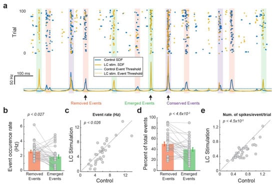 LC stimulation altered the temporal structure of VPm responses. (a) Characterization of different types of events of an example VPm neuron. (b) Rate of the removed events and emerged events. (c) LC activation decreased the number of events. (d) Percentage of the removed events and emerged events. (e) Number of spikes per event in a trial with and without LC stimulation.