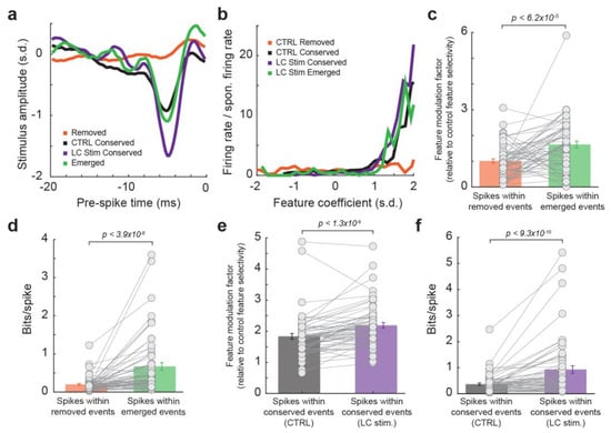 Emerged events during LC activation transmitted more information than removed events. (a) Example encoded feature by spikes within removed events (orange), conserved events without LC stimulation (black), conserved events with LC stimulation (purple), and emerged events (green). (b) Nonlinear tuning function for the spikes within the four types of events. (c) Feature modulation factor for spikes within removed events vs. spikes within emerged events. (d) Information transmission for spikes within removed events vs. spikes within emerged events. (e) Feature modulation factor for spikes within conserved events without LC stimulation vs. spikes within conserved events during LC stimulation. (f) Information transmission for spikes within conserved events without LC stimulation vs. spikes within conserved events during LC stimulation.