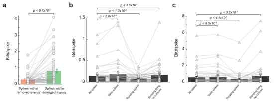 To examine the extent to which the effect of LC activation on the thalamic temporal code resulted from the reduction in burst firing during LC stimulation, we first deleted all bursting spikes from spike trains and then assessed the information transmission for spikes within removed events and spikes within emerged events. Similar to results from spike trains containing bursting spikes, the spikes within removed events transmitted less information than spikes within emerged events (Figure 4a, 0.28 ± 0.04 vs. 0.80 ± 0.12, p < 8.7 × 10−8, Wilcoxon signed-rank test, 32 neurons from 19 rats). This further analyses adds more evidence that it was not simply the NE-mediated removal of these bursting spikes that caused the LC-activation-induced increase in information transmission. Indeed, bursting spikes are suboptimal for information transmission, as a burst consists of multiple spikes of which only one is likely to be optimally temporally aligned to the feature. We see this reflected in the data as spikes in bursts carried less information than the average spike with and without LC stimulation (Figure 4b,c, without LC stim: 0.14 ± 0.025 vs. 0.08 ± 0.01 bits/spike, p < 1.3 × 10−6, Wilcoxon signed-rank test; with LC stim: 0.57 ± 0.12 vs. 0.37 ± 0.09 bits/spike, p < 4.1 × 10−5, Wilcoxon signed-rank test; 32 neurons from 19 rats). However, when bursting occurrences were considered each as a single spike, they carry significantly more information than the average spike (Figure 4b,c, without LC stim: 0.14 ± 0.025 vs. 0.17 ± 0.027 bits/spike, p < 3.5 × 10−4, Wilcoxon signed-rank test; with LC stim: 0.57 ± 0.12 vs. 0.71 ± 0.17 bits/spike, p < 3.2 × 10−3, Wilcoxon signed-rank test; 32 neurons from 19 rats), suggesting bursts themselves are not inherently uninformative (see Section 4. Discussion).