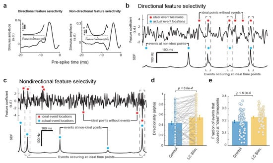 After the directionality of each feature selectivity was calculated, we then identified the peaks in the corresponding feature coefficient which would be most ideal to position our events. Here, we conserved the same number of events as observed in the original response but moved these event times to be located at the peaks in the feature coefficient vector with the largest positive values for directionally selective features (Figure 5b, red stars) or largest absolute values for non-directionally selective features (Figure 5c, red stars). We were then able to compare these ideal event time points with the actual event time points observed with and without LC stimulation (Figure 5a,b, blue stars). Here, we found that LC stimulation increased the fraction of events that occurred at an ideal event time point (Figure 5e, 0.20 ± 0.01 without LC stimulation vs. 0.23 ± 0.01 with stimulation, p < 6.0 × 10−6, paired t-test, 32 neurons from 19 rats). Taken together, consistent with the previous results, this showed that LC activation resulted in a changing of the temporal event structure in such a way that favors more informative, and therefore more optimal, event locations.