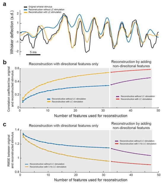 As expected, we found that the final reconstruction was significantly more accurate when using the spiking response and feature selectivity of the neurons during LC stimulation than without LC stimulation (Figure 6a). This indicated that LC stimulation optimized the encoding of sensory-related information in the thalamus in a manner which allows for a more accurate recovery of the original stimuli from the thalamocortical spike trains. This suggests the accuracy of the perception of stimuli could be enhanced as well. Indeed, in our previous work, we found that LC stimulation enhanced the perceptual sensitivity of rats discriminating between two different frequencies of whisker stimulation []. We then wanted to quantify how LC stimulation affects how closely the reconstruction matches the original stimulus. Further, we were interested in how the number of VPm neurons used for decoding affected the accuracy of reconstruction of the stimulus. To this end, we performed the above method of decoding of the stimulus from directional PSTH–feature pairs multiple times for each possible number of features used. For each directional reconstruction, the order of features added was randomized and the correlation coefficient between that reconstruction and the original stimulus was saved. When looking at a plot of average correlation coefficient versus number of features used for directional reconstruction, we found, as expected, that the accuracy of the reconstruction increased with the increasing number of features used (Figure 6b). We also found that the more features used, the less additional accuracy adding another feature provides, indicating that there was some redundancy in the information carried by each of the encoded features. Importantly, we found that no matter how many features were used for reconstruction, LC stimulation resulted in a more accurate reconstruction as measured by either correlation coefficient (Figure 6b) or root-mean-square deviation (RMSE) between the reconstruction and original stimulus (Figure 6c). Interestingly, we observed that the difference between the accuracy of reconstruction with and without LC stimulation increased as the number of features decoded increased, suggesting that LC activation decreased the redundancy of information carried by VPm neurons. We further performed a similar analysis investigating how adding in different amounts of non-directional features improved the reconstruction accuracy (Figure 6b). The results of this analysis also showed that LC stimulation resulted in a more accurate reconstruction when decoded from both directional and non-directional features (Figure 6b,c).