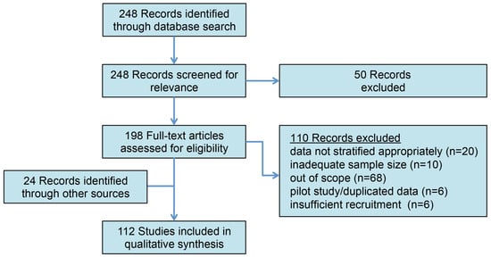The PRISMA outline of article selection. The initial search identified 248 records for review. Following the abstract review and the exclusion of non-relevant studies, 112 studies were included in the qualitative analysis.