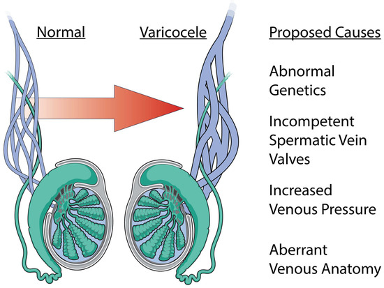 Nearly half of the fifty-five million couples suffering from infertility worldwide will have difficulty conceiving due to male-factor infertility [1,2]. Varicocele, defined as an abnormal enlargement of the pampiniform plexus of gonadal veins above the testicle, is the leading correctible cause of male-factor infertility and is found in 35–44% of men with primary infertility and 45–81% of men with secondary infertility [3,4,5,6]. Clinically, varicoceles reduce sperm quantity and quality, slow testicular development in adolescents, cause dull discomfort and pain, and decrease testosterone levels [7,8,9,10]. While prior studies have identified numerous anatomic, genetic, and molecular contributors to varicoceles, the true factors underlying the development of male varicoceles remain largely unknown [11]. Furthermore, the molecular underpinnings predisposing only a subset of men to pathological changes continue to evolve and haveincreasing relevance for clinical management [12].