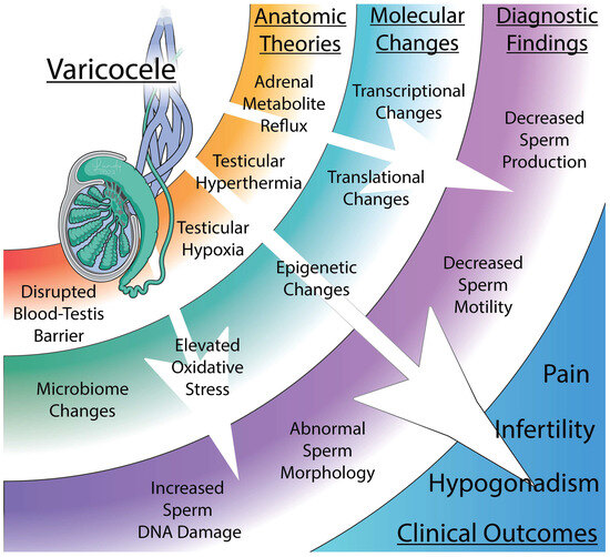 The anatomic, molecular, and diagnostic findings associated with varicoceles. Varicocele formation is thought to negatively affect male fertility through a variety of mechanisms. Dilation of the pampiniform plexus may increase adrenal metabolite reflux, induce testicular hyperthermia or hypoxia, or disrupt the blood–testis barrier. These anatomic changes affect protein expression and change the native microbiome which can result in decreased sperm motility, abnormal morphology, and increased sperm DNA damage. Collectively, these factors lead to several clinical outcomes, including infertility, hypogonadism, and testicular pain.
