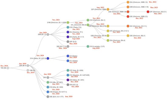 Phylogenetic relationships of SARS-CoV-2 clades. Covariants follow the Nextstrain Clade schema, where variants can descend from other variants. Starting from this figure, it is possible to show how the Omicron variant (21M clade, B.1.1.529) gave rise to a greater number of VOI/VOC. The tree has been generated from https://covariants.org (accessed on 29 January 2024). The red labels represent the date of first detection of each variant. As highlighted, XBB.1 showed a greater number of subvariants in a relatively short time.