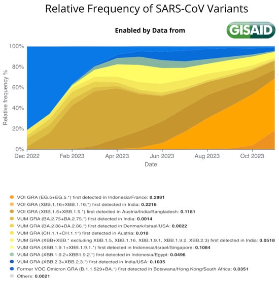 Figure shows the relative frequency of the SARS-CoV-2 variants from January 2023 until September 2023. It highlights the relatively rapid evolution of the virus and the rise of EG.5.1 variant since May 2023. Data extracted from https://gisaid.org/hcov-19-variants-dashboard/ [22] (accessed on 28 November 2023).