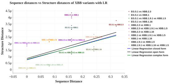 The x-axis of the graph displays the pair-wise sequence distances calculated on the primary structure, while the y-axis reflects the pair-wise mutual distances of the protein structures. Each point on the graph represents the correlation between a pair of sequences and the structure distance [31]. The figure shows no correlation between sequence and structure distances, confirming the similarity in evolution between XBB descendants and the whole SARS-CoV-2 phylogeny. Figure 4 reports the relationships among structure and sequence distances of the XBB variants. By calculating the linear regression (the blue straight line reported in the figure), we obtained a low correlation index (i.e., an R-squared score equal to 0.213), which showed no evidence of a structural relationship between sequence and structure. The measure of the significance of the correlation is reported in Table 2, where both corrected false discovery rates [32] indicate a nonsignificant evidence of correlation between sequence and structure below the statistical significance threshold of 0.01. We conclude that these correlation analyses report a moderate but not strongly statistically significant correlation between XBB protein structure (in closed, open, and wild typeorm) and sequence. Interestingly, there is no difference in terms of general evolution of the spike protein, as analyzed in [13], where no correlation among sequence and structure was reported.