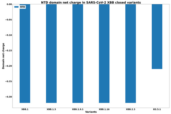 First, in Figure 5 we report the net charge of N-terminal domain (NTD) in each XBB.1 variant. We report a negative charge in all variants, indicating affinity to bind to human ACE2. We report similar values for all the XBB.1 subvariants except for EG.5.1 due the specific mutations of these variants. Surprisingly, EG.5.1 is more similar to Omicron than to XBB when considering the net charge of the NTD domain.