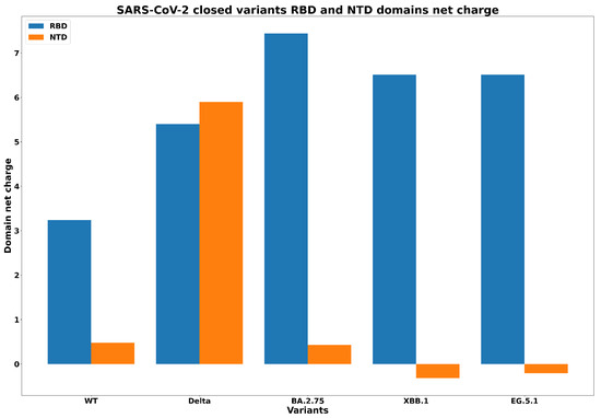 Net charges in the NTD and RBD domains for wild type, Delta, (Omicron) BA.2.75, XBB.1, and EG.5.1 variants in closed conformation.
