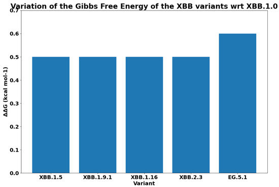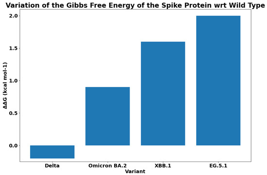 Gibbs free energy difference G between Delta, BA.2 Omicron, XBB.1, and EG.5.1 variants with respect to wild type.