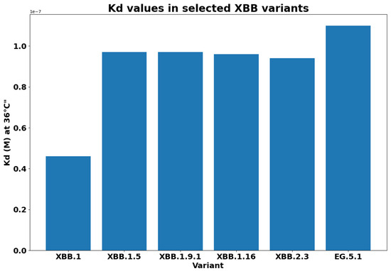 Dissociation constant for XBB descendant variants. A higher value of determines a stronger binding affinity. Note that EG.5.1 has the greatest binding affinity to the ACE2 receptor.