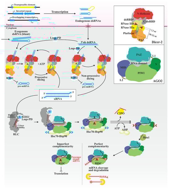 The first major pathway, mediated by siRNAs (Figure 1), is triggered by the presence of perfectly complementary dsRNAs or RNA hairpins in the cell cytoplasm. It is mainly involved in silencing exogenous RNAs [,], although multiple subtypes of siRNAs with endogenous origin (esiRNA) exist. esiRNAs can derive from transposable elements, genomic regions with inverted repeats and from mRNAs with overlapping sequences (natural antisense siRNA, natsiRNA) [,,,,]. esiRNAs are involved in maintaining genome stability [,,] and regulation of gene expression in certain cellular processes, such as energy homeostasis or the response to several stresses [,,].