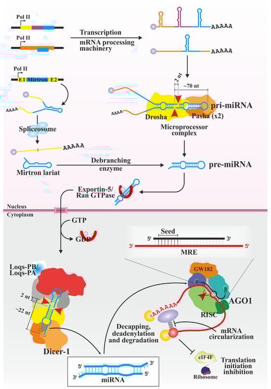 The pri-miRNAs are processed in the nucleus [] by the type-III ribonuclease Drosha, with the help of Pasha, a dsRBPs with which it forms the Microprocessor complex [,,]. The processing of pri-miRNAs is especially studied with the human counterpart of the Microprocessor, probably occurring similarly in insects [,,,,,]. Two Pasha proteins recognize and bind the terminal loop of the pri-miRNA, and their dsRBDs interact with part of the dsRNA region. Drosha dsRBD binds the other half of the dsRNA, and additional interactions are established with the terminal ssRNA-dsRNA region. Both Drosha and Pasha contacts ensure the binding of suitable substrates, acting together as a molecular rule and accepting RNAs with two ssRNA regions separated by a dsRNA of about 35 bp. Additional RNA motifs may affect processing efficiency []. The two RNase III domains of Drosha eliminate the basal single-stranded segments and part of the dsRNA (~11 nt), generating miRNA precursors (pre-miRNAs), hairpins of about 70 nt with one of the characteristic 2 nt protruding 3′ ends of miRNAs. As an alternative to this canonical biogenesis pathway, one subtype of miRNAs is derived from introns; thus, they are known as mirtrons. For their maturation, they depend on the splicing machinery and debranching enzymes but not on the Microprocessor, directly entering the pathway as pre-miRNAs with a hairpin structure [,].