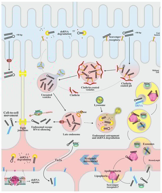 In some insects, dsRNA delivery can result in the generation of a systemic response by short- and long-distance RNAi signal movement. It is likely that the signal is transmitted by direct intercellular contact through membranous protrusions called tunneling nanotubes (TnTs) that allow the connection between cells. Viral infection in D. melanogaster cell cultures induces the formation of these structures that transport dsRNA and components of the RNAi machinery []. In addition, as occurs in mammals [] movement of the RNAi signal through tight junctions could be possible, although not yet demonstrated. Over long distances, dsRNA movement appears to occur through hemolymph. In certain insects, hemolymph nucleases efficiently degrade dsRNA [,,], hampering the systemic response and effectiveness of RNAi. dsRNA transport in the hemolymph is mediated by carrier molecules, thus protecting it from degradation. The dsRNA-binding ability of apolipophorins purified from the hemolymph of Bombyx mori [] and Schistocerca gregaria (and probably in species of the orders Orthoptera, Blattodea and Diptera) [] has been demonstrated, strongly suggesting a conserved mechanism in insects. Apolipoforins are the protein components of lipophorin, hemolymphal lipoprotein complexes which function in lipid transport and are also part of the insect antiviral defense. Lipophorins are scavenger receptor ligands, and in ticks, these receptors have also been implicated in systemic RNAi []. RNAs are also carried by extracellular vesicles. miRNA-containing vesicles have been identified in D. melanogaster cell cultures [], and their occurrence in vivo has been proposed []. Furthermore, viral infection in this species generate viral siRNAs that are packed in vesicles that circulate through hemolymph, systemically diffusing the RNAi signal []. As for exogenously supplied RNAs, the encapsulation of long dsRNAs and derived siRNAs has been shown in extracellular vesicles of Tribolium castaneum and Leptinotarsa decemlineata cell cultures [,]. In the latter, some of the factors related to endosomal generation and recycling pathways participating in the process were detailed. The full extent of these mechanisms, as well as the possible involvement of additional factors, have yet to be fully resolved.