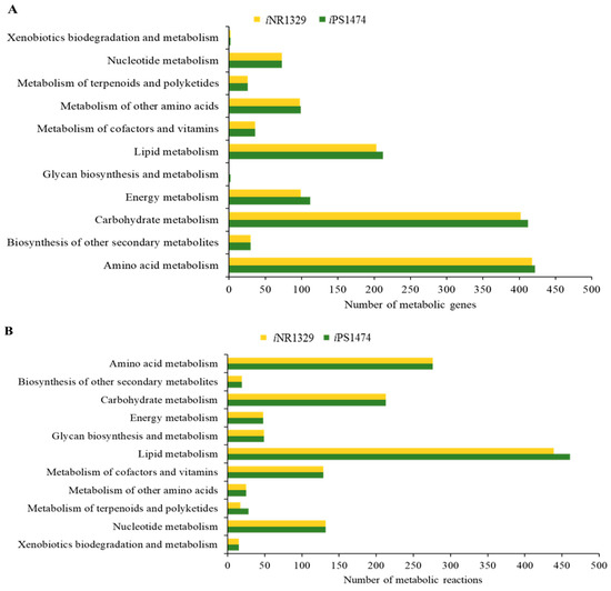 (A) Number of metabolic genes and (B) number of metabolic reactions in comparison between iNR1329 and iPS1474 of C. militaris.
