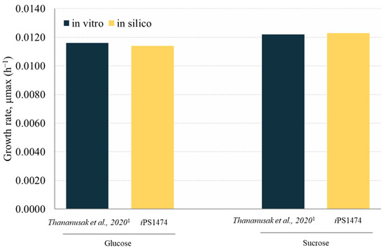 Validation of iPS1474 by comparison of growth rate (h−1) between in silico and in vitro data across different carbon sources, i.e., glucose and sucrose. Note: Data were taken from 1 Thananusak et al., 2020 [26].